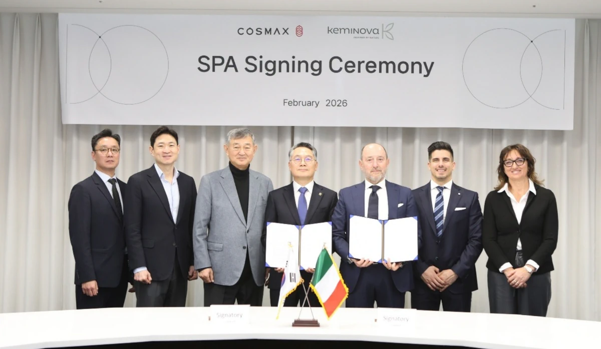 La photo qui suit la signature de l’accord le 20 février 2026 au siège de COSMAX en Corée et en présence de messieurs Kyung-soo Lee, président du groupe COSMAX (troisième à partir de la gauche), Kyoung Choi, vice-président et PDG de COSMAX (quatrième à partir de la gauche), Byung-joo Lee, vice-président et PDG de COSMAX BTI (deuxième à partir de la gauche) et Mauro Franzoni, PDG de Keminova (troisième à partir de la droite), ainsi que d’autres membres des deux sociétés