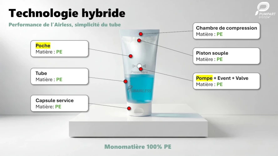 Pumpart System, entreprise française basée à Paris, a été fondée par Jérôme Boumnso et Xavier Sutty qui en est aujourd’hui le CEO. Le premier, après des études en physique nucléaire, venait du secteur pharmaceutique et le second avait travaillé dans les hautes technologies en Business Development international. « Nous suivions de près l’industrie cosmétique, explique Xavier Sutty, nous voulions nous y engager. Le constat était simple : dans l’univers de la beauté, il manquait une solution entre le tube qui est l’emballage le plus utilisé, et le flacon Airless qui répond aux enjeux de préservation des formules sensibles et de confort d’utilisation. Nous avons inventé Tubairless™ en intégrant une poche souple dans un tube, la poche jouant le rôle de cocon et de piston. Il s’agit d’un emballage airless hybride, monomatière, 100% PE et qui est le plus léger du marché ».